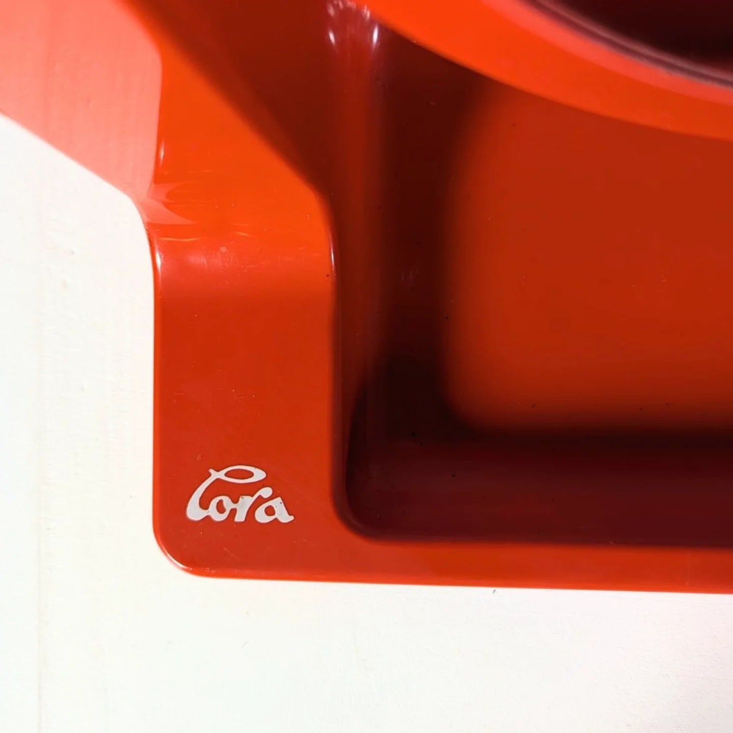 Structure en ABS rouge orangé, miroir rond orientable, et deux douilles latérales permettant de choisir les ampoules pour créer l’ambiance souhaitée (douce ou plus franche).